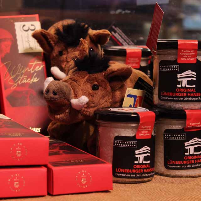 Hier finden Sie eine feine Auswahl von Artikeln rund um das Thema Salz: Bücher, Kristalle, Salze aus aller Welt, Salzketten, Körperpflegeprodukte, salzige Wundertüten und vieles mehr. Ein besonderes Souvenir ist unser „Original Lüneburger Hansesalz“, gesiedet in der Schausiedehütte des Museums.