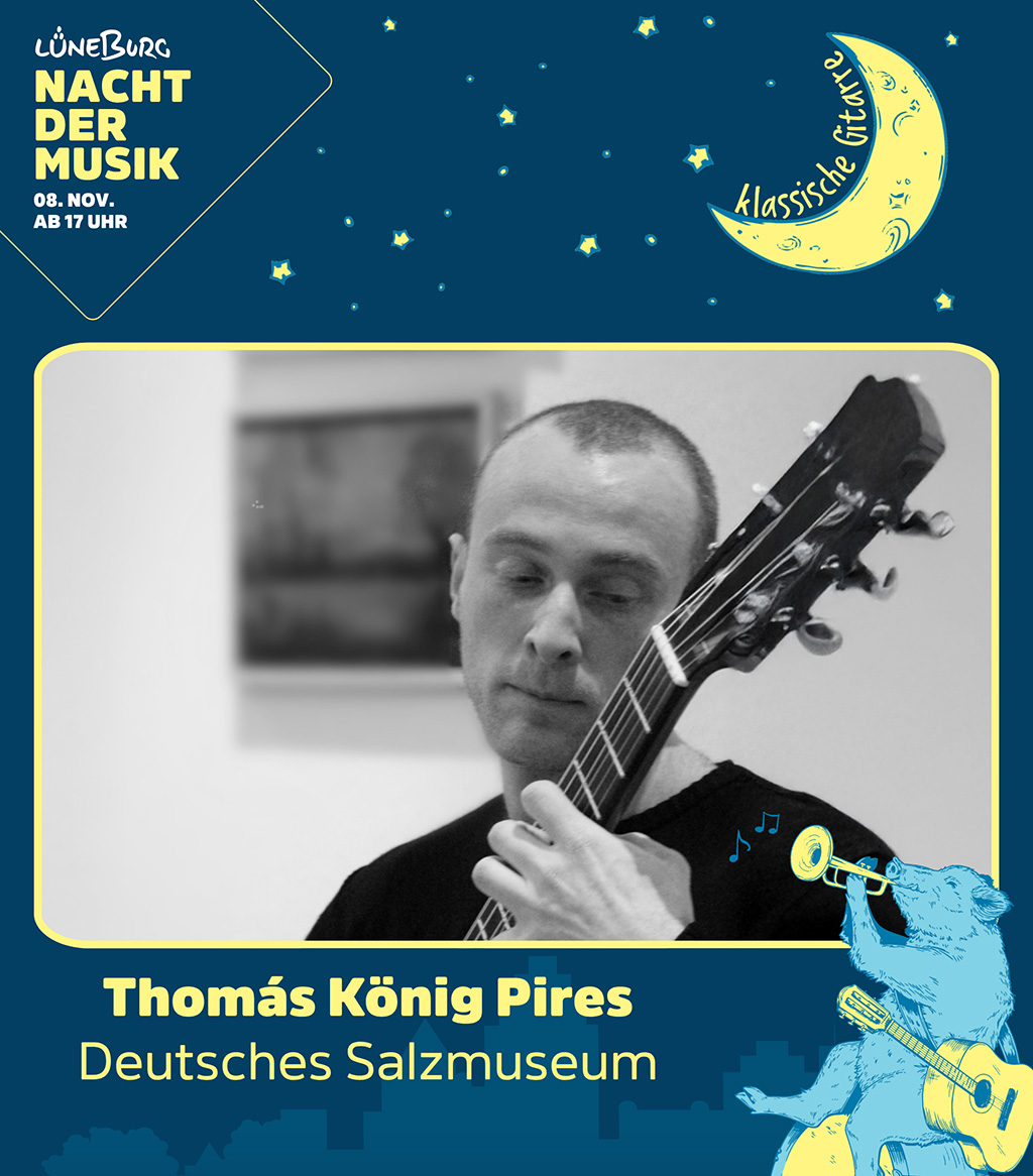 Der Gitarrist Thomás König Pires spielt an diesem Abend drei Konzerte im historischen Brunnenhaus. Er wurde in Porto Alegre, Brasilien geboren, einer Region, wo die brasilianische und Gaucho-Kulturen koexistieren. Sein Repertoire umfasst eine breite Palette von Stilen & Genres, von der Musik der Renaissance bis zu Uraufführungen zeitgenössischer Werke internationaler Komponisten. Seit 2020 lehrt er an der Musikschule Lüneburg. Zur Nacht der Musik spielt der Gitarrist klassische Musik aus Brasilien und der Pampa.